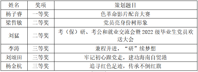 本次大赛的评委由yl88858永利中国党委副书记黄小欧老师和各支部书记、副书记等9名同志组成,采用匿名方式对参赛的策划进行了评定,最终结果如下: