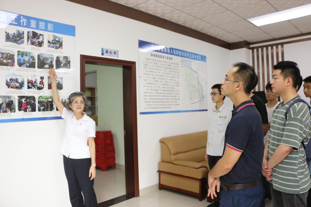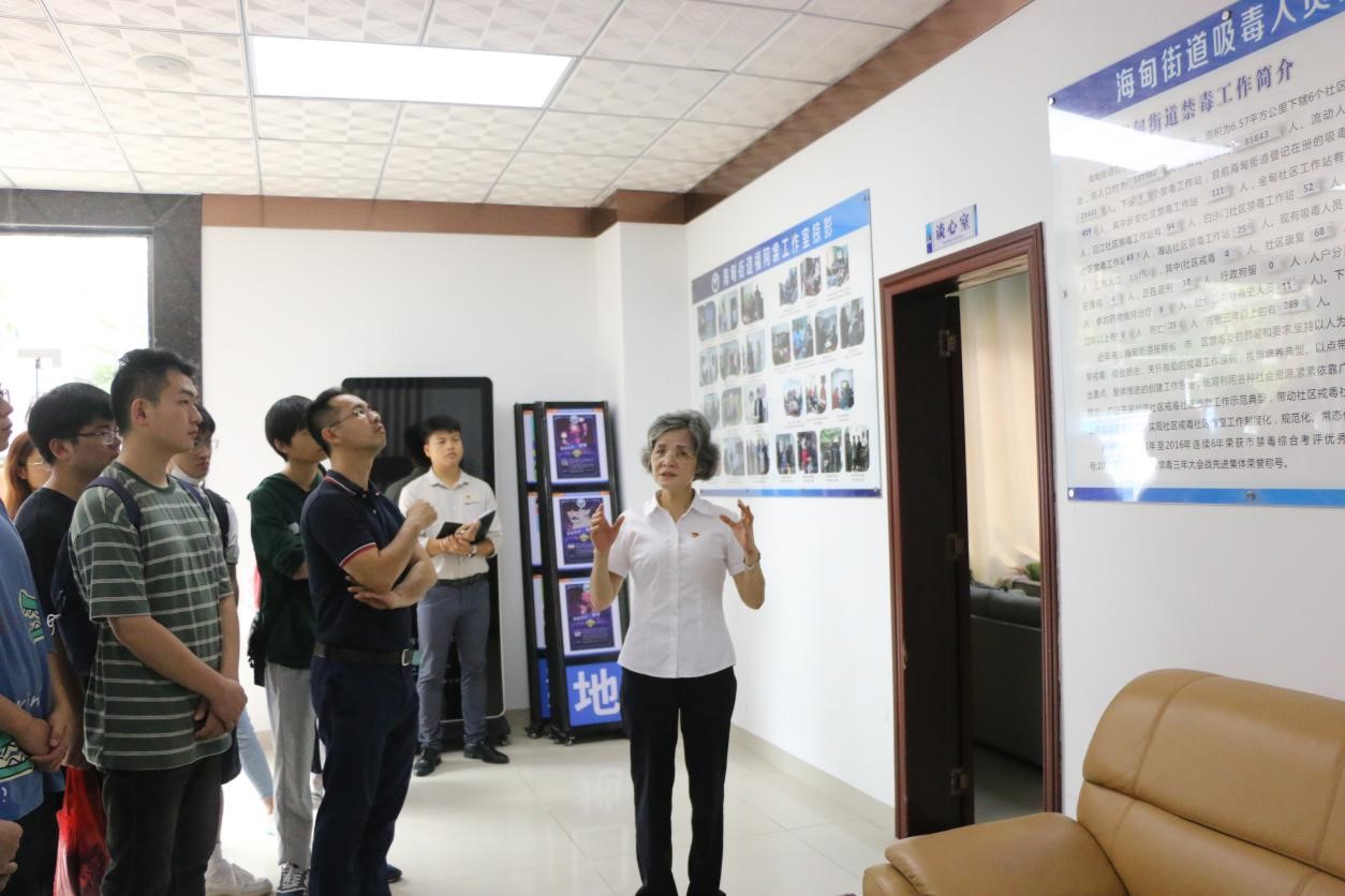 符良玲主任带领陈鹏老师及同学们进入海岸线驿站大厅并介绍街道社区戒毒康复办公室“海岸线”驿站命名的含义。“海”即代表海南、海口、海甸,“岸”即代表呼唤戒毒康复人员早日回归社会,而“线”代表由公安民警和禁毒专职人员深入社区一线开展禁毒工作。通过取名海岸线驿站,构建“家”一般的社区戒毒康复氛围,增强戒毒康复人员回归社会的自信和决心,同时也强化了管段民警、禁毒专职人员和社区干部的向心力和凝聚力。随后,同学们在符良玲主任的带领下参观了福阿袰办公室、图书角、沙盘治疗、禁毒专职人员办公室、工作流程、档案室等。