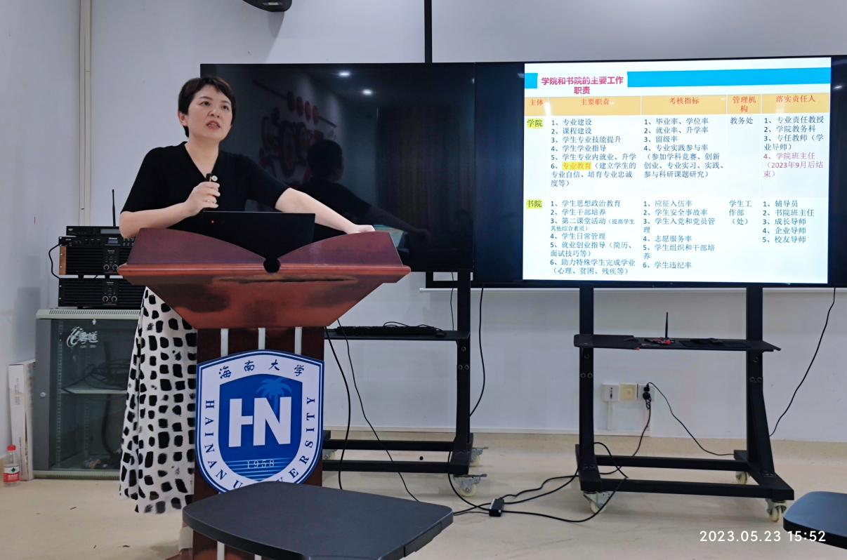 王红英还讲解了学院与书院的主要工作职责,明确了学业导师的主要工作内容,指导学业导师开展学业指导工作,就如何提高学生毕业率和升学率、就业率,如何减少延长修业年限学生的比例,如何提高学生参与学科竞赛、参与专业实习实践,提高就业能力等方面,以及如何处理特殊问题的学生等提出了自己的指导意见。