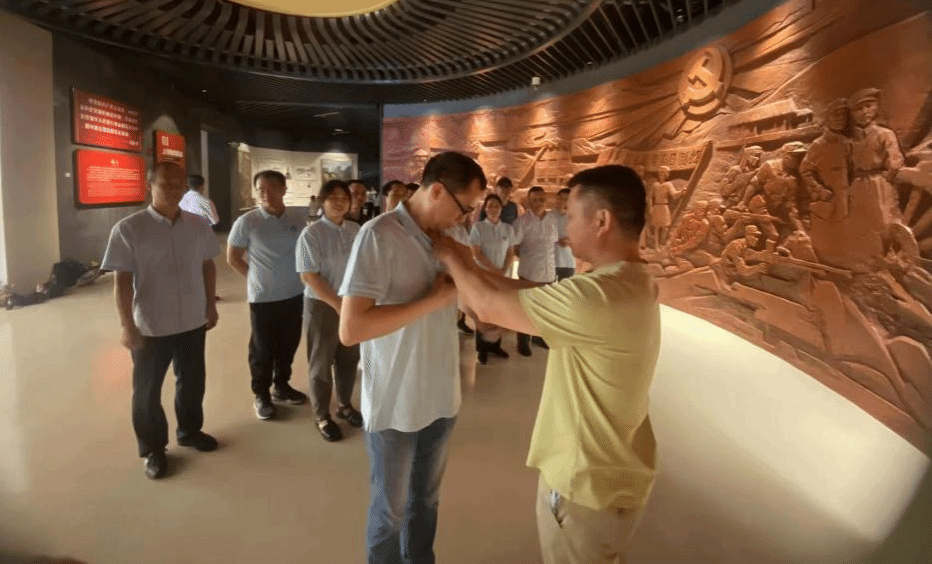 入党介绍人吴星同志为宣誓入党的徐太星同志佩戴党员徽章