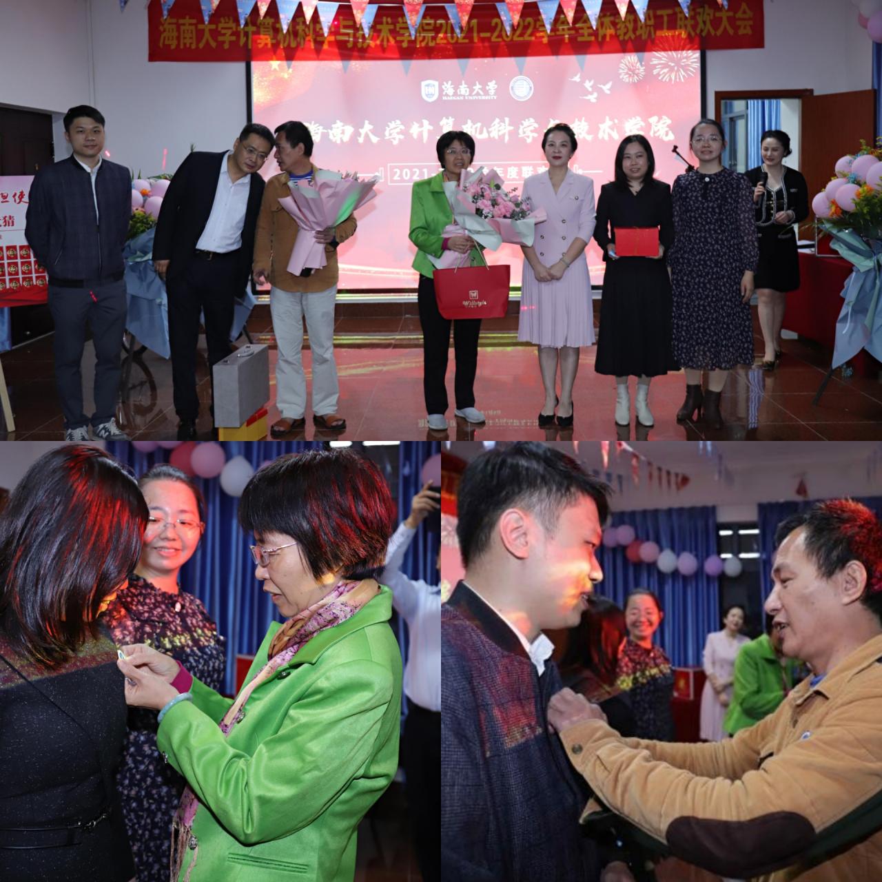 联欢大会还举行了一个特别的荣退迎新仪式,随着聚光灯暗下,大屏幕上放映出学院工会为2022年即将退休的陈文贤、詹尊策两位老师拍摄的荣退视频——海大的美景......办公室的工位......同事们饱含深情的祝福......一帧帧画面,都定格在这个美好的夜晚。即使光荣地退休,离开工作的岗位,计算机学院也永远是他们温暖的家!在一片掌声中,杨院士和王书记代表学院向他们赠送了退休纪念品,学院新引进和调入的四位新老师冯浩、沈笑、李华和郑虹则向两位退休老师敬献了鲜花,并由退休老师亲手为新人们佩戴上了计算机学院的院徽。在场的教职工都深深的被这场仪式打动了,因为这代表着计算机学院一种生生不息的传承。