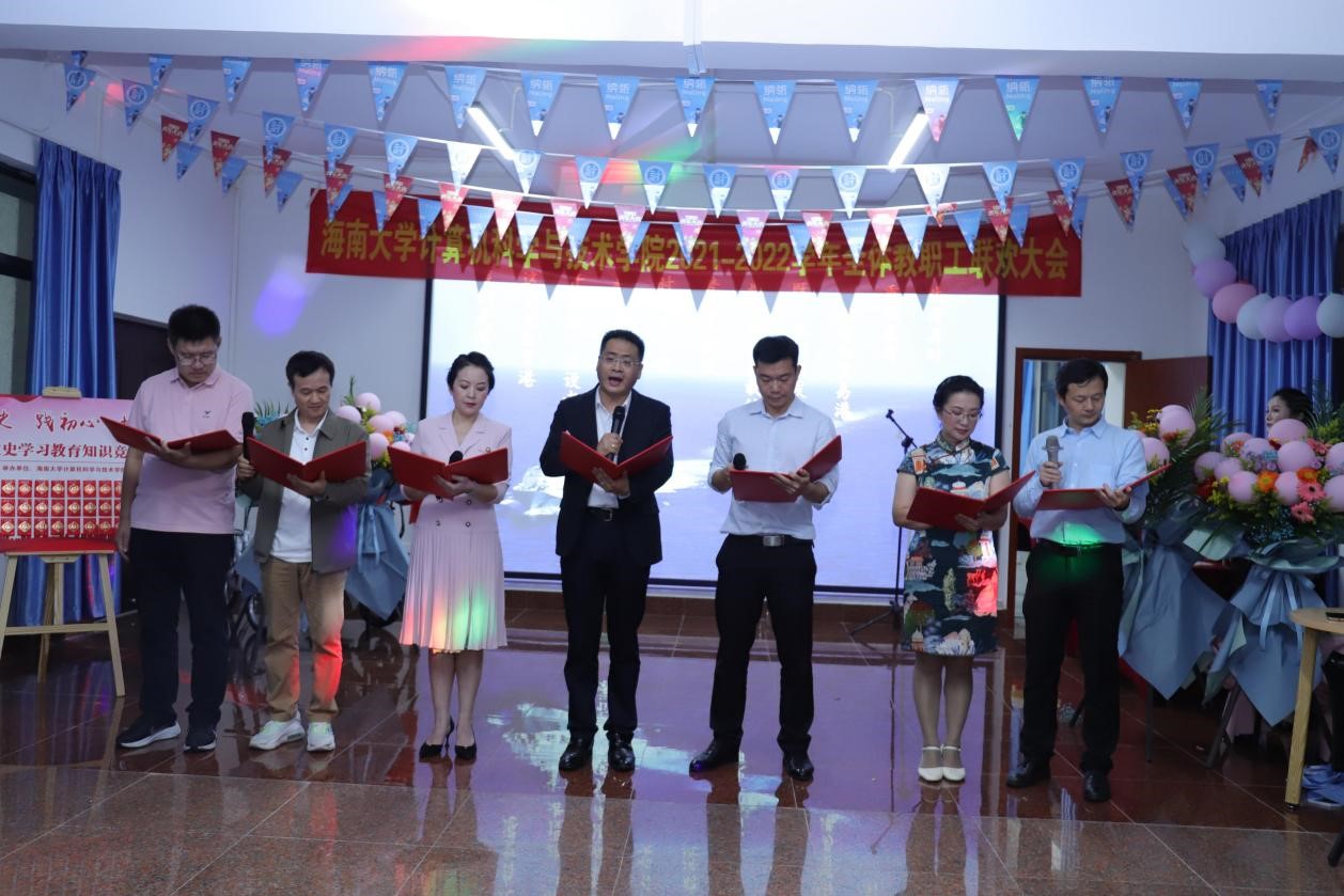 紧接着,学院领导班子集体亮相,在杨天若院士、王红英书记的带领下,学院新一届年轻而朝气蓬勃的班子成员用坚定而洪亮的声音,朗诵了一首《自贸港里的闯海人》。“生逢其时,重任在肩,海南自由贸易港,既是我们拥有的发展空间,也是我们承载的伟大使命......我们都将是海南自贸港的见证者、开创者、建设者!”这既像是宣言,表达着计算机学院每一位教职工乐观向上的态度;也像是号角,集结着计算机学院每一位教职工奋勇向前的力量!