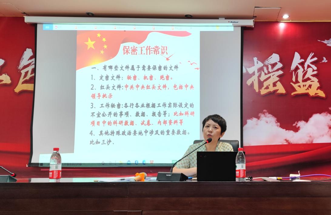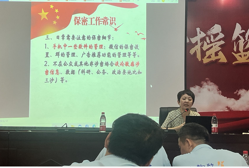 书记王红英从保密文件分类、如何对保密信息进行保密、日常需要注意的保密细节等方面进行保密工作常识教育培训。