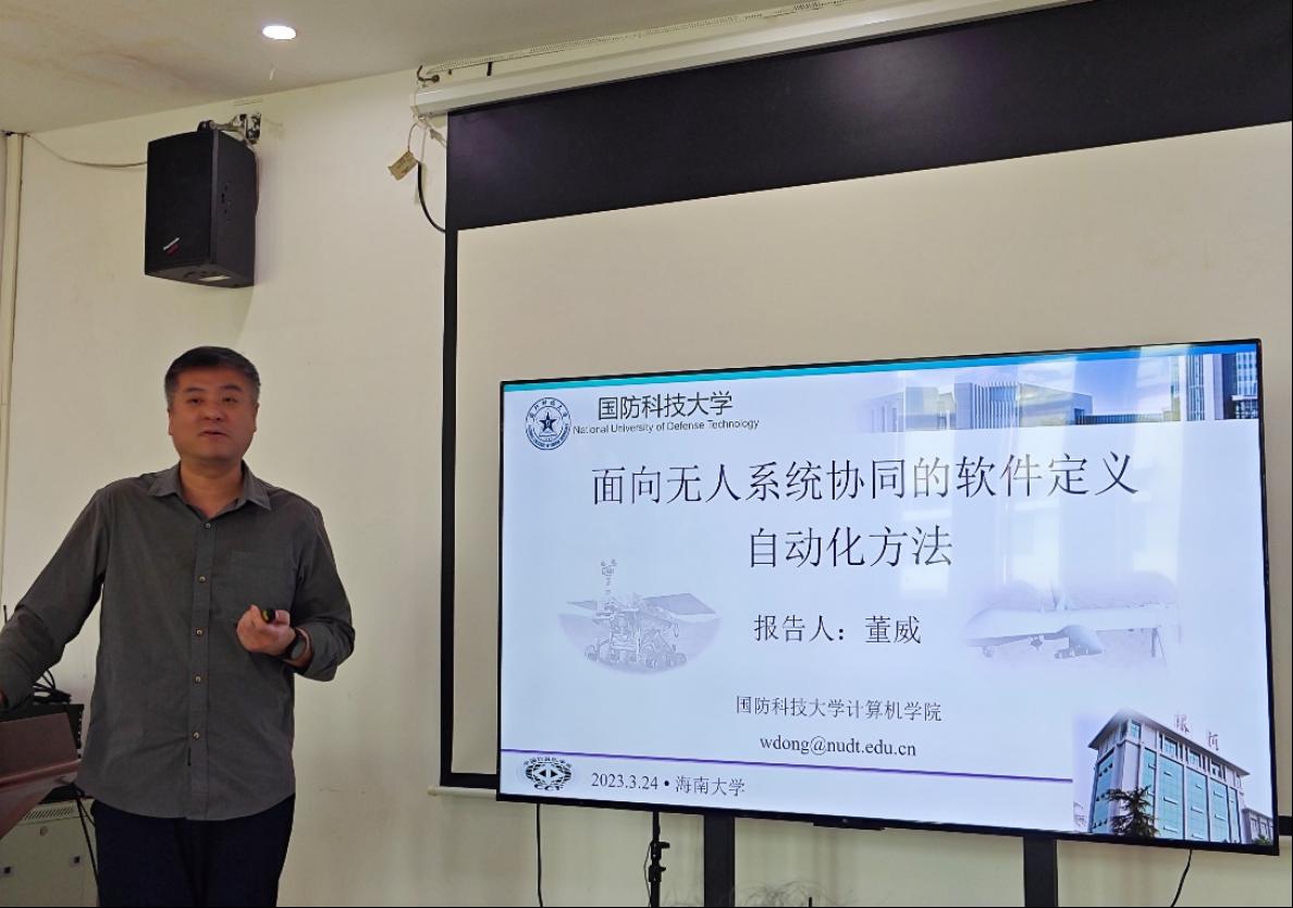 董威教授的报告题目是“面向无人系统协同的软件定义自动化方法”。人机物融合系统HCPS越来越受到广泛重视,其中面向具体任务和场景,自动、高效地生成满足要求的无人系统控制程序具有重要研究与应用价值,但也具有非常高的难度,尤其是对于需要协同的多无人系统更具有挑战性。董教授首先对人机物融合系统的发展进行了简要描述,然后对以程序综合与验证为基础的协同无人系统软件定义自动化工作进行了介绍。
