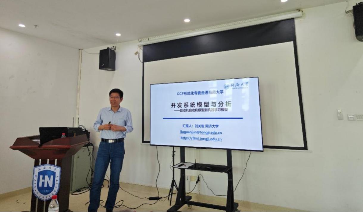 刘关俊教授的报告题目是“并发系统模型与分析:由自动机模型到机器学习模型”。主要介绍了刘关俊教授团队在基于Petri网的模型检测上的一些研究工作。另外,深度强化学习近年来在无人系统领域得到越来越多的重视,这种由机器学习生成的系统控制模块在应对复杂的运行环境以及应对系统自身复杂的交互协同上抱有极大的期望,然而这种训练出的决策模型在可解释性、鲁棒性等诸多方面仍有很长的路要走,刘教授也介绍了一些在这方面的思考与相关研究。