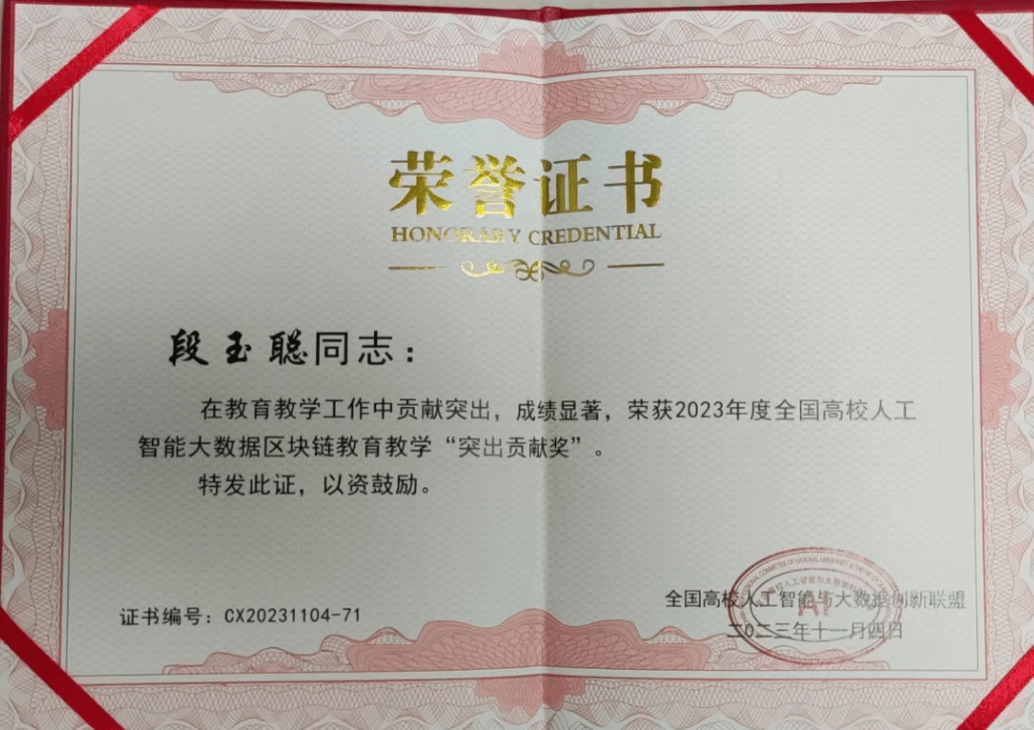 全国高校人工智能与大数据创新联盟为了表彰2023年度全国高校人工智能大数据区块链元宇宙教育作出突出贡献的单位和个人,经过联盟组织专家的严格审查,我校yl88858永利中国段玉聪教授荣获2023年度全国高校人工智能大数据区块链教育教学“突出贡献奖”。