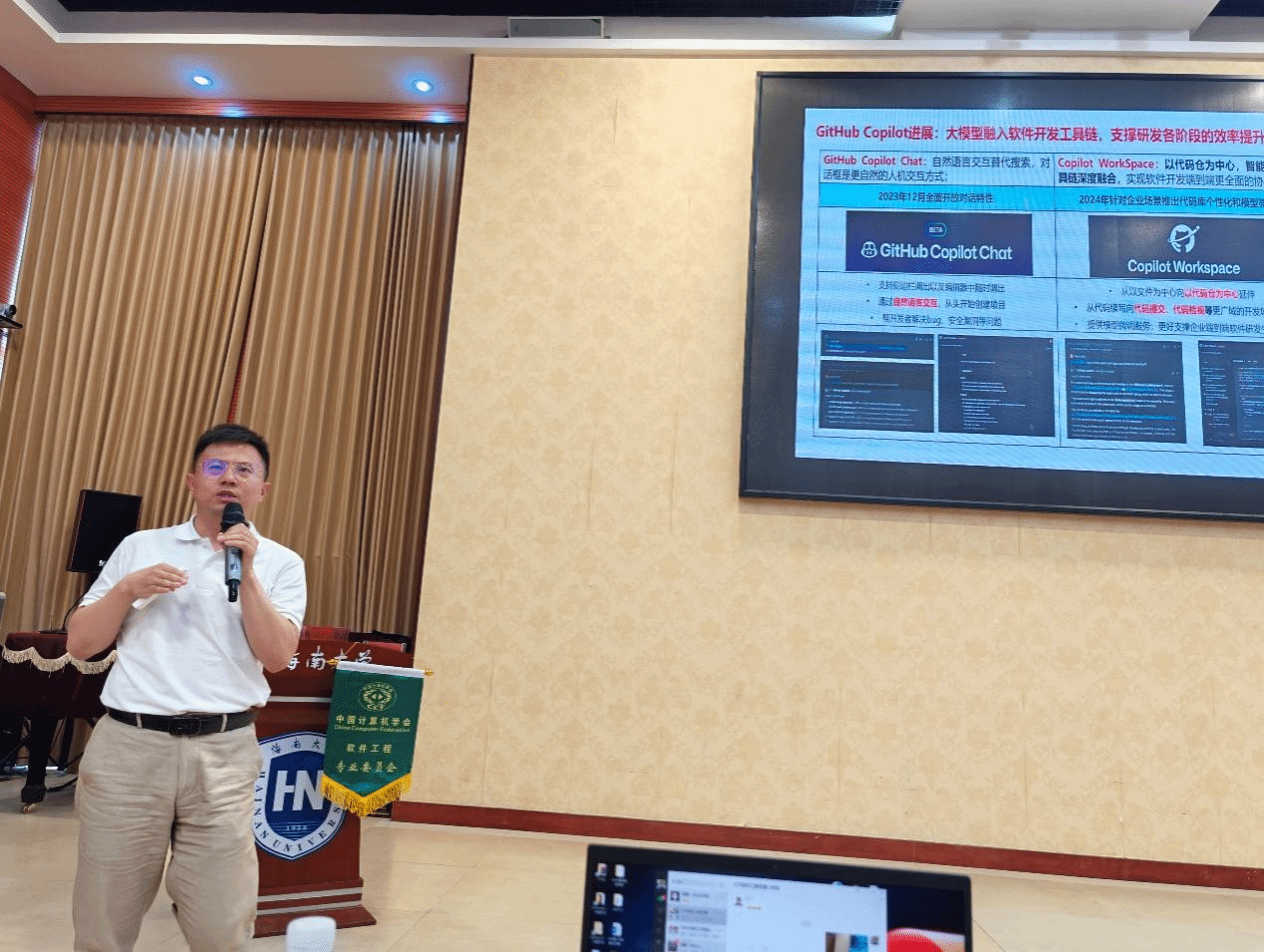 开幕式上,谢夏代表学院向大会致词,对全体与会嘉宾和师生的到来表示欢迎和感谢。受邀嘉宾马晓星、彭鑫、梁广泰分别以《管窥智能化软件》、《迈向更高层次智能化的生成式软件开发》、《华为云智能开发辅助技术实践与分享》为题进行了精彩的讲座,并就相关问题与师生展开了深入交流。会议设置提问环节,同学们积极提问,现场反响热烈。